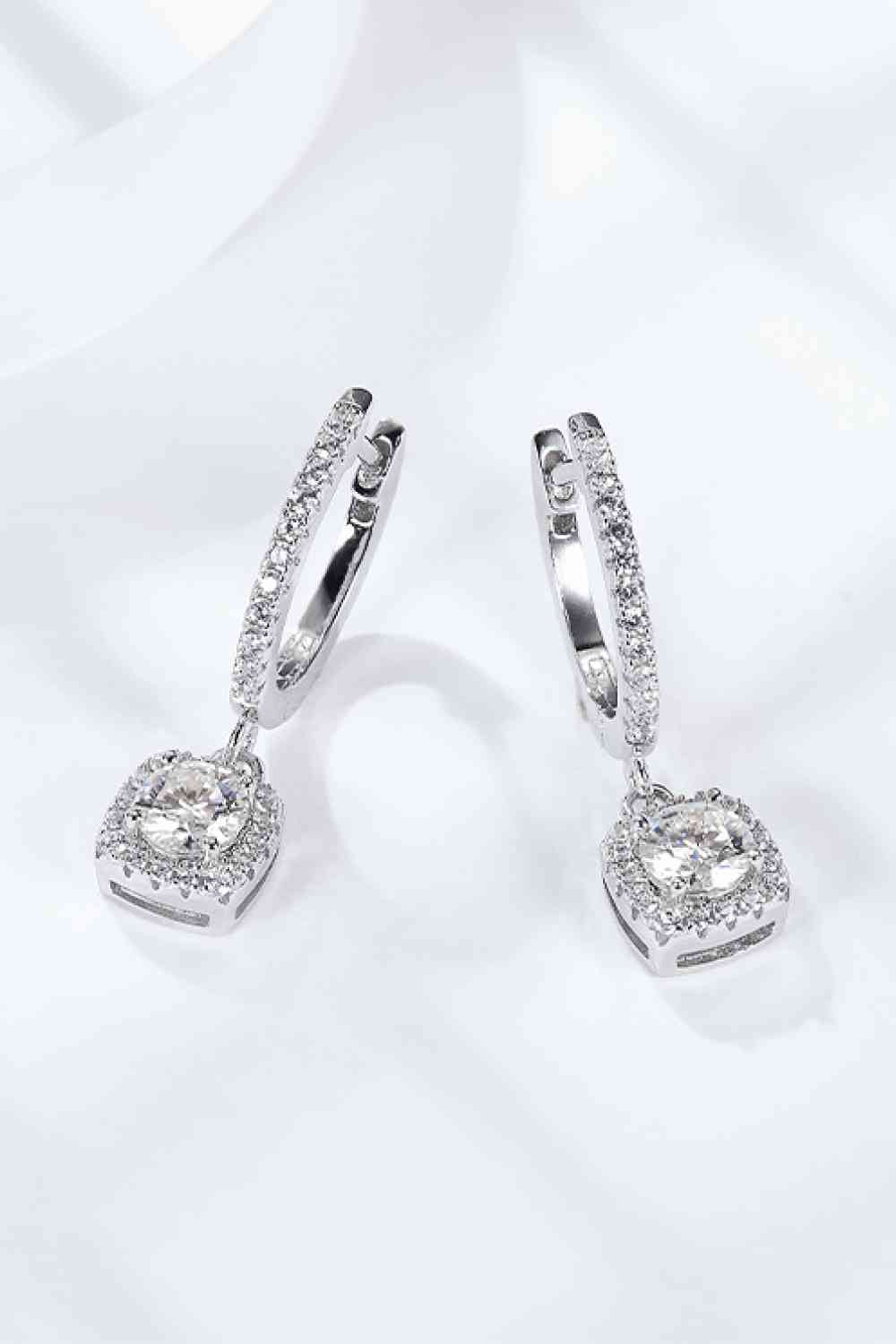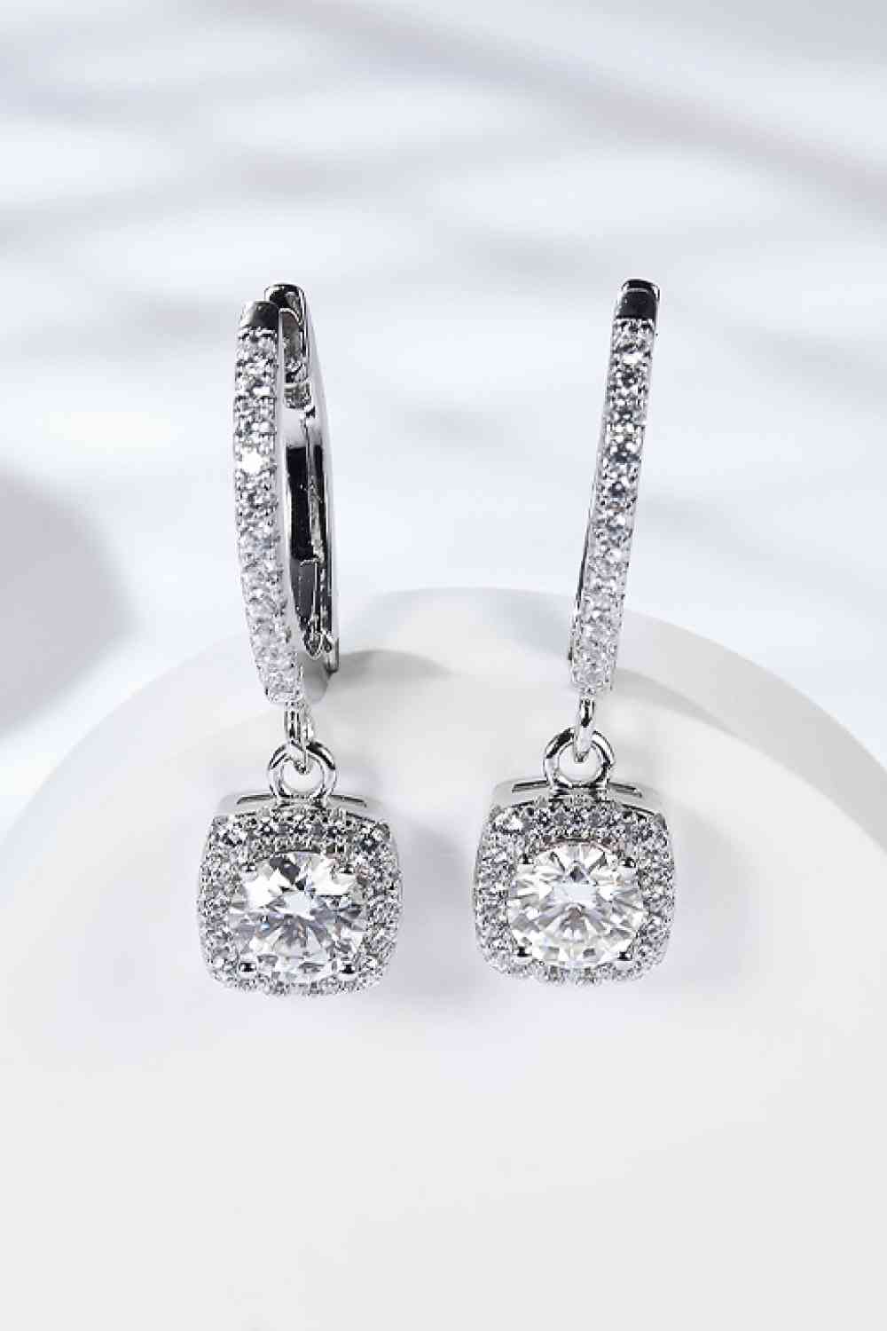 Introducing our Elegant Moissanite Huggie Drop Earrings, a modern take on classic elegance. These stunning earrings feature a geometric design that exudes contemporary style, while the brilliance of moissanite adds a timeless appeal. Crafted from high-quality 925 sterling silver and finished with a platinum plating for added durability and shine, each earring showcases a dazzling 1-carat moissanite stone, complemented by sparkling zircon accent stones. With a total moissanite weight of 2 carats across the pair, these earrings are designed to make a statement.