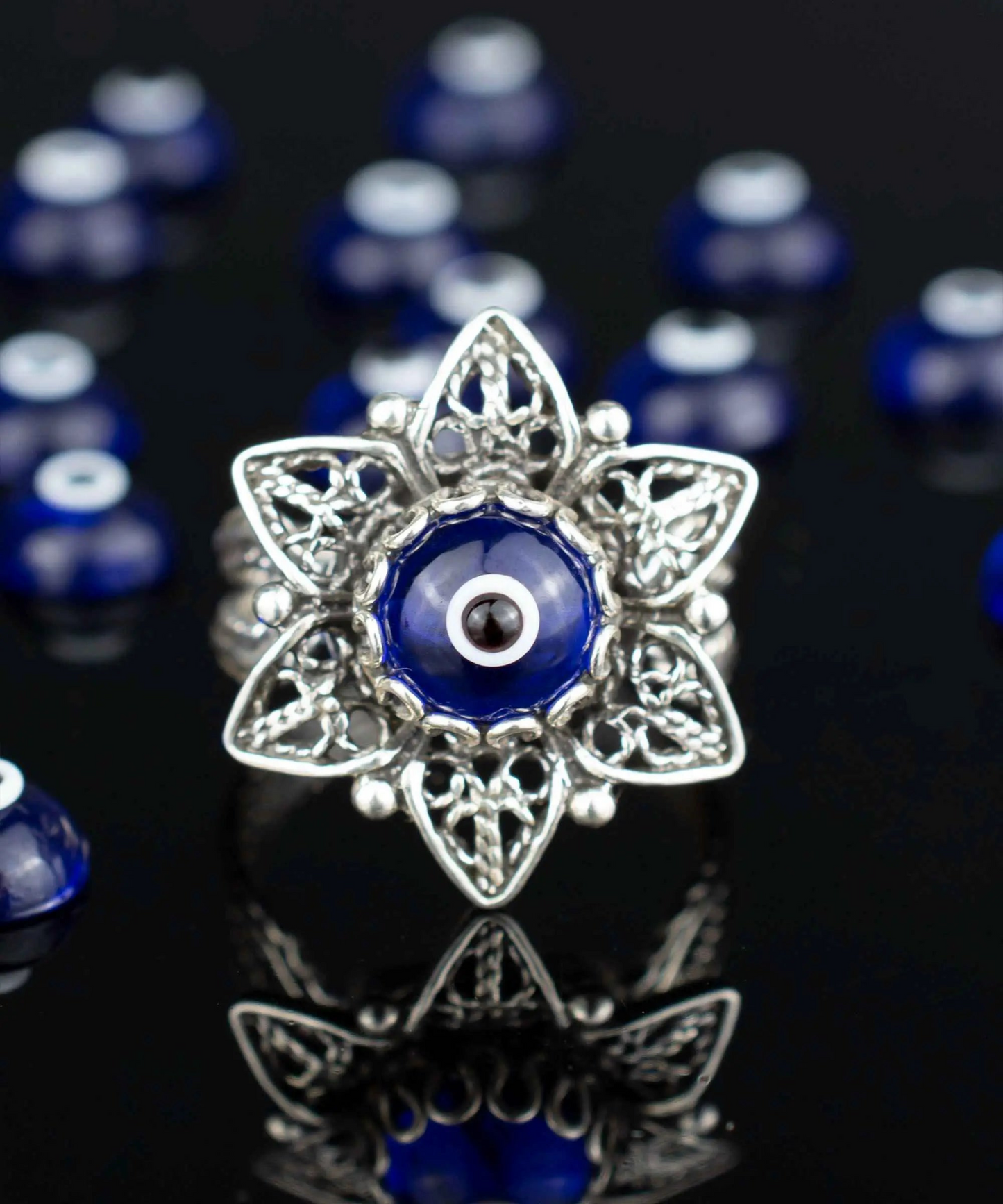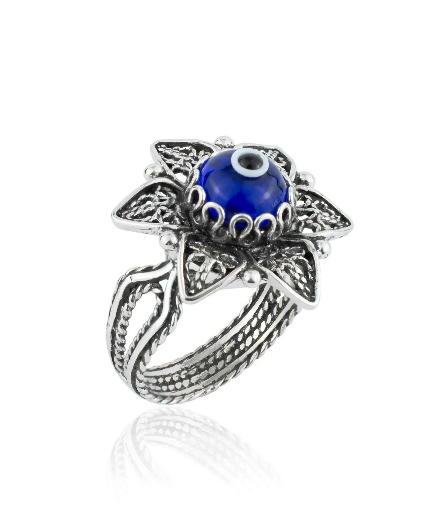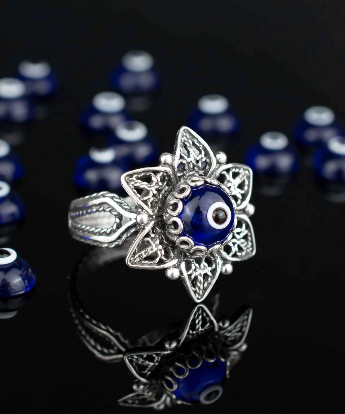 Elevate your style with the Blue Evil Eye Daisy Filigree Silver Cocktail Ring and carry a symbol of protection and beauty wherever you go. This piece is more than just jewelry; it's a testament to the enduring charm of filigree art and the timeless appeal of symbols that cross cultures and generations.