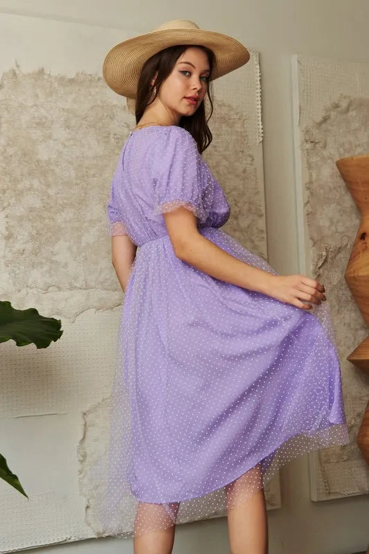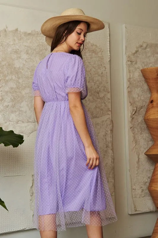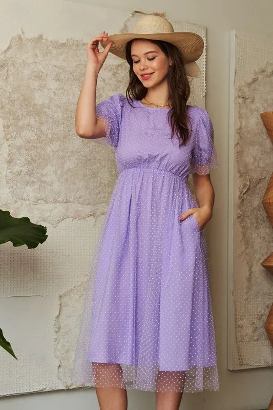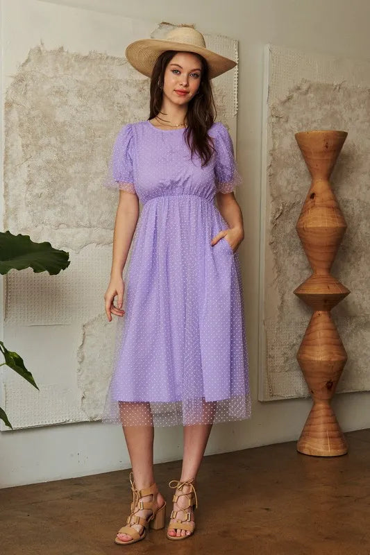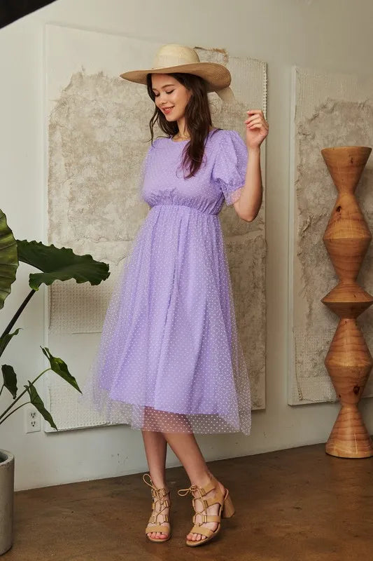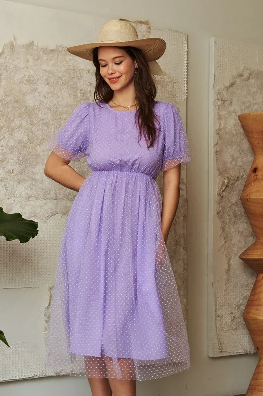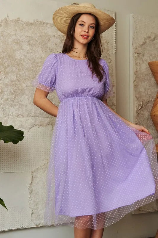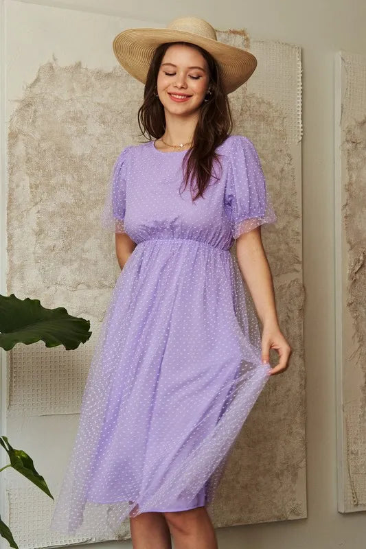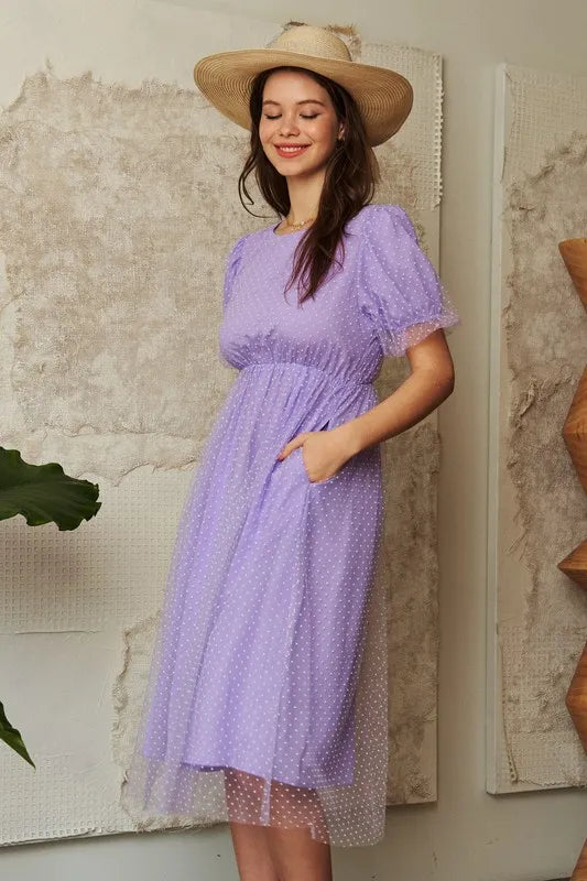 Davi & Dani Mesh Puff Short Sleeve Midi Dress - Lavender