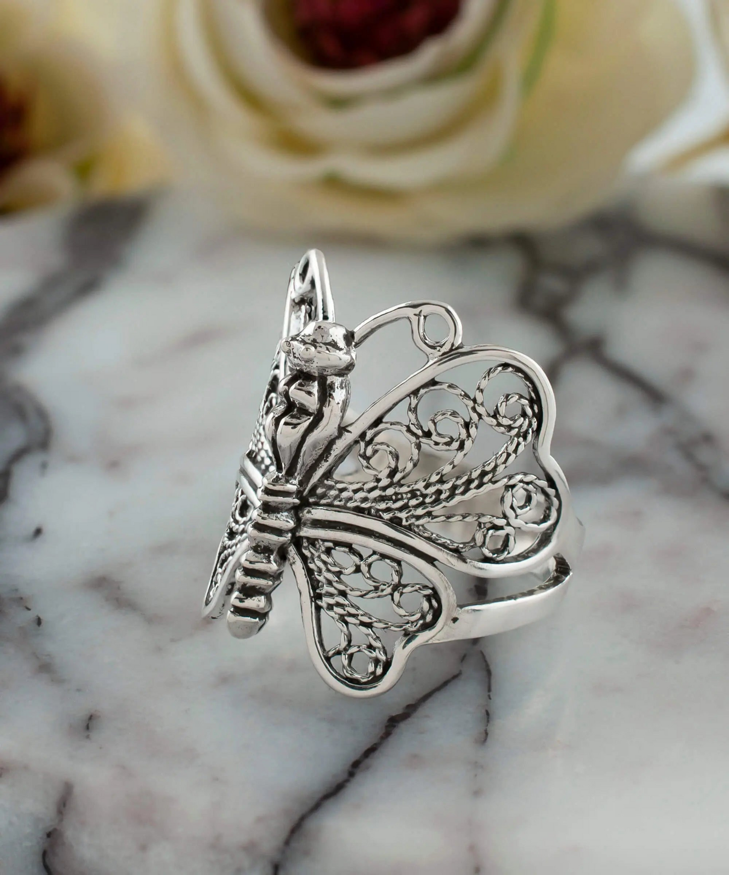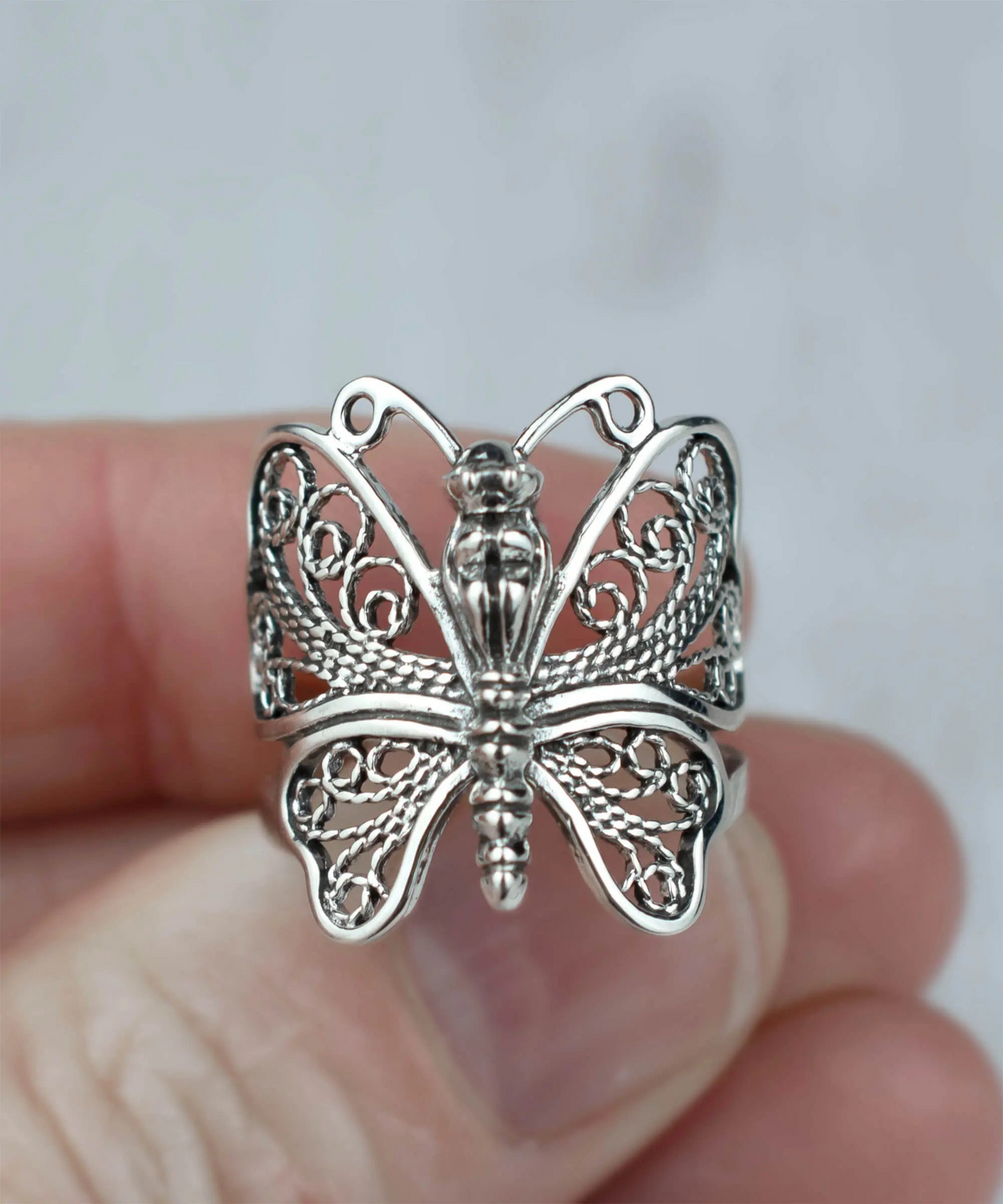 Embrace the timeless elegance and sophisticated artistry of the Filigree Butterfly Silver Statement Ring. Whether adorning your hand for special occasions or adding a touch of beauty to everyday moments, this ring is a statement of exquisite taste and a celebration of the enduring allure of filigree art.