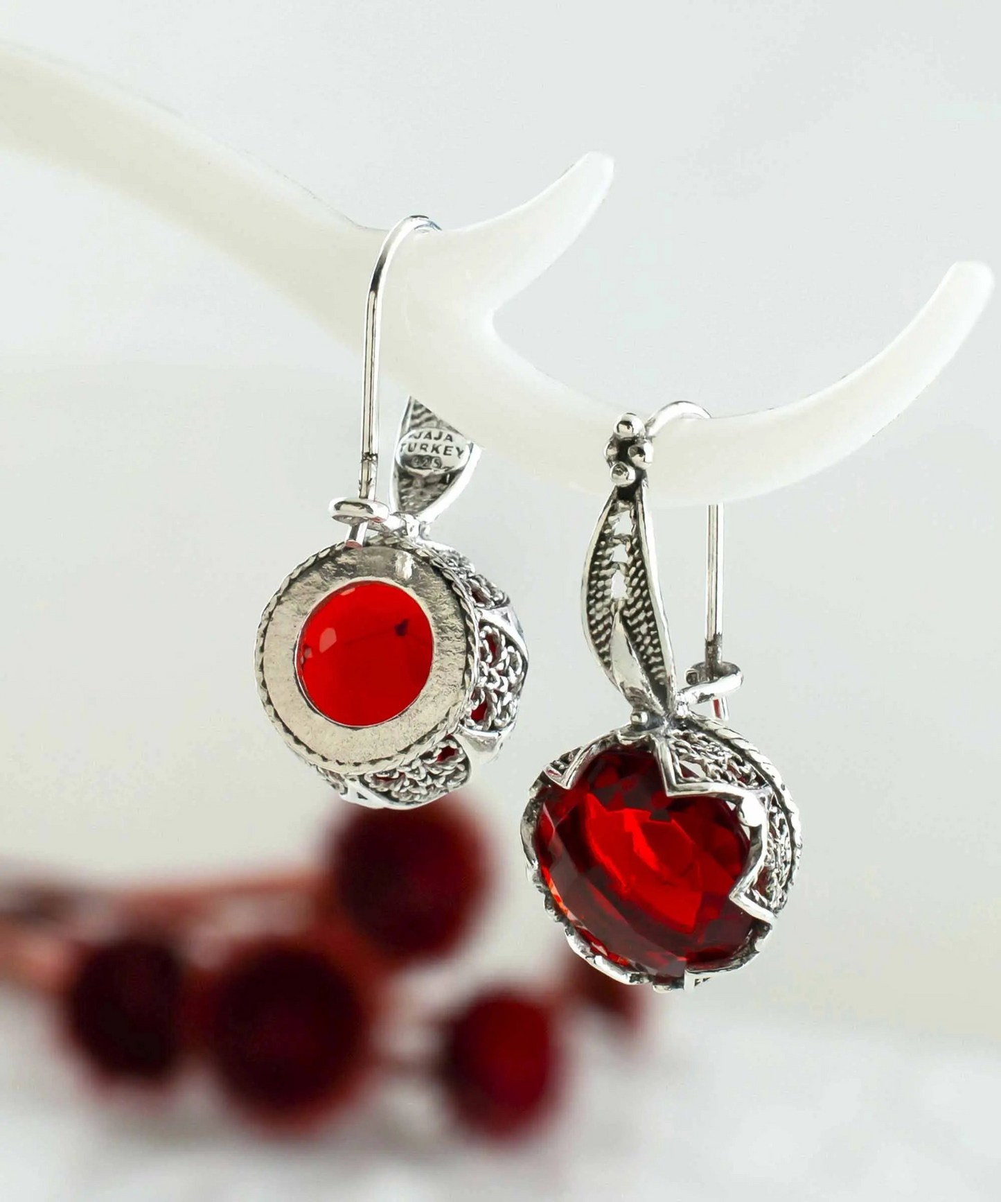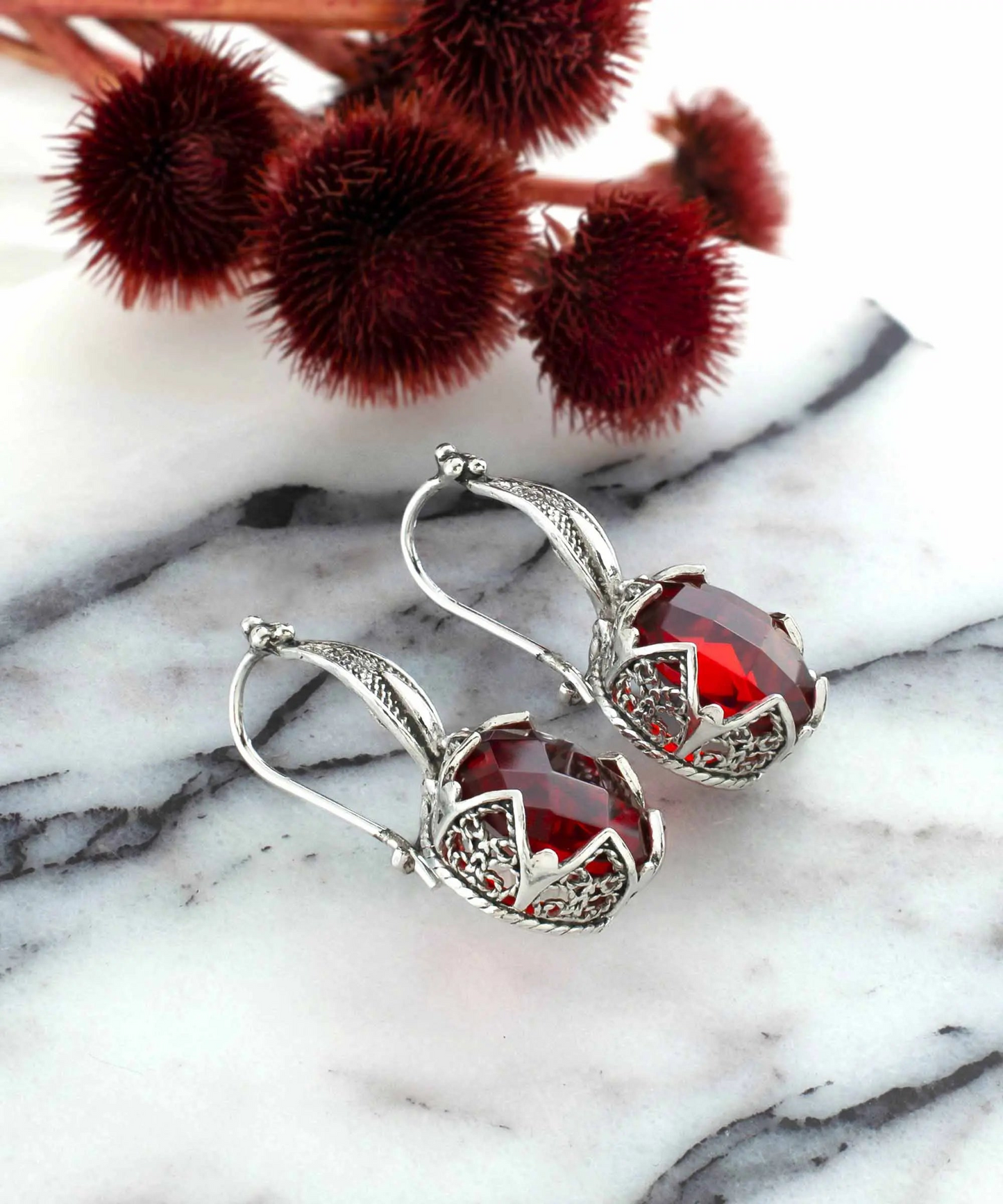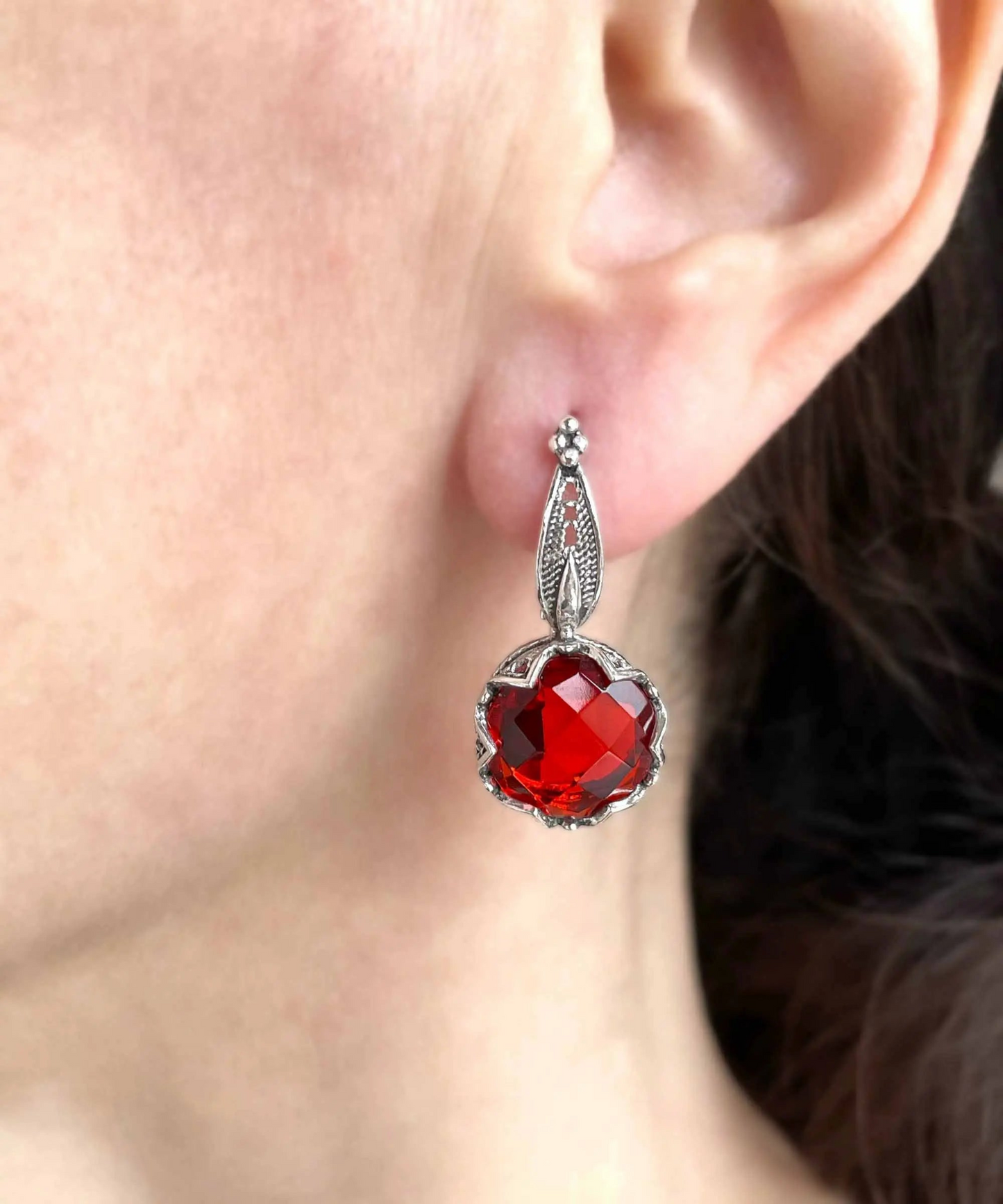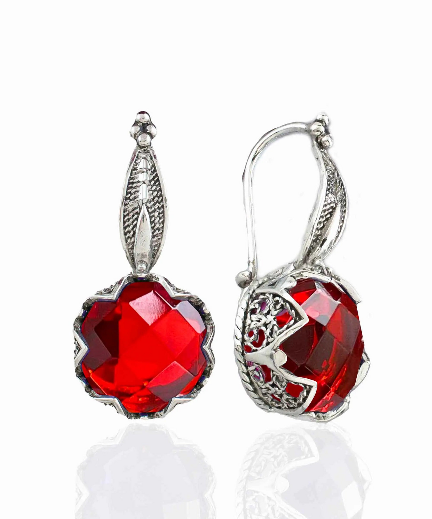 FiligranIst - Filigree Flower Motif Ruby Gemstone Sterling Silver Woman Drop Earrings