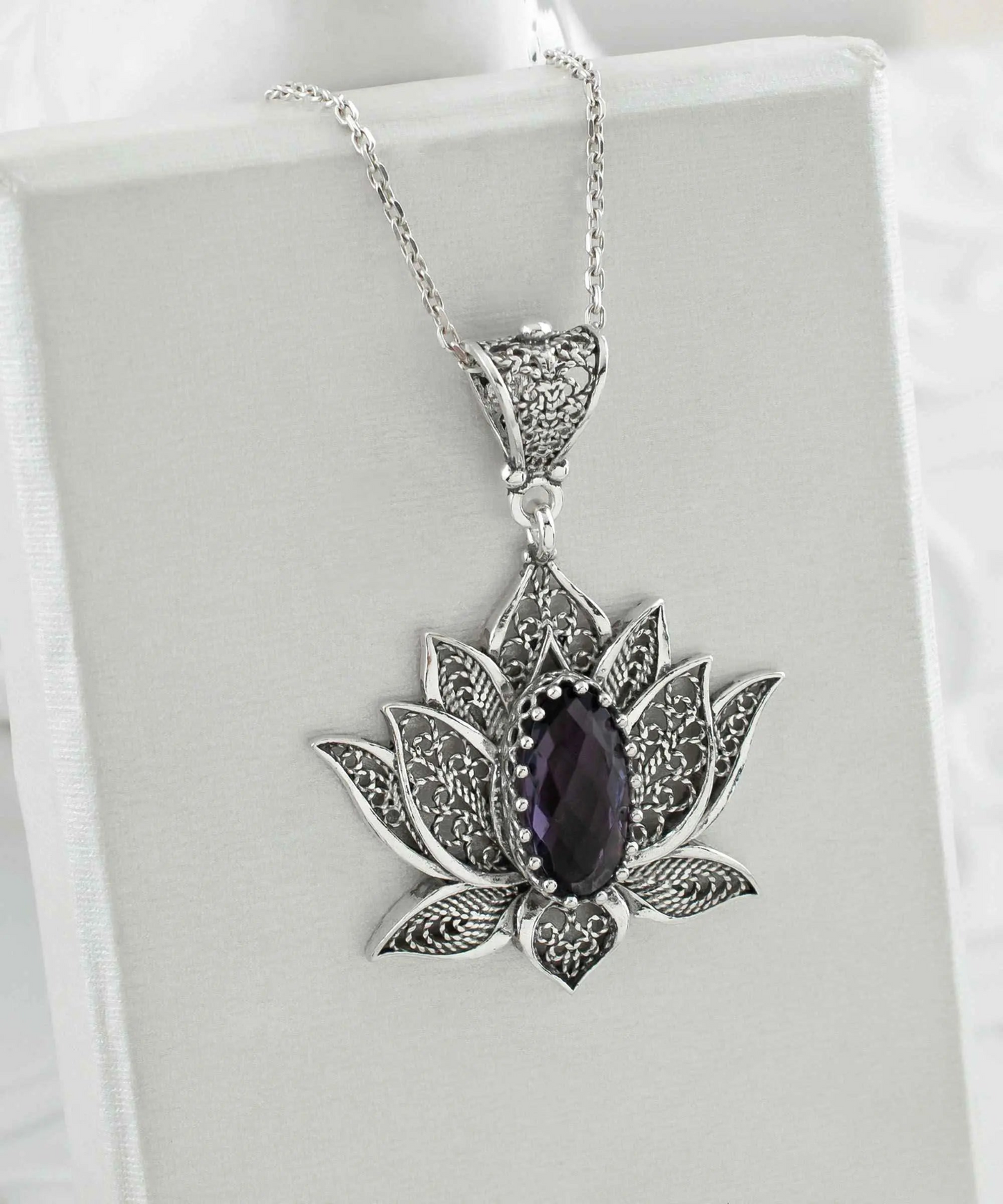 Embrace the timeless beauty of our Filigree Art Amethyst Gemstone Blossoming Lotus Flower Women Silver Pendant Necklace and add a touch of elegance and sophistication to your ensemble. Whether worn as a daily accessory or on special occasions, this exquisite necklace is sure to make a statement and become a cherished keepsake for years to come.
