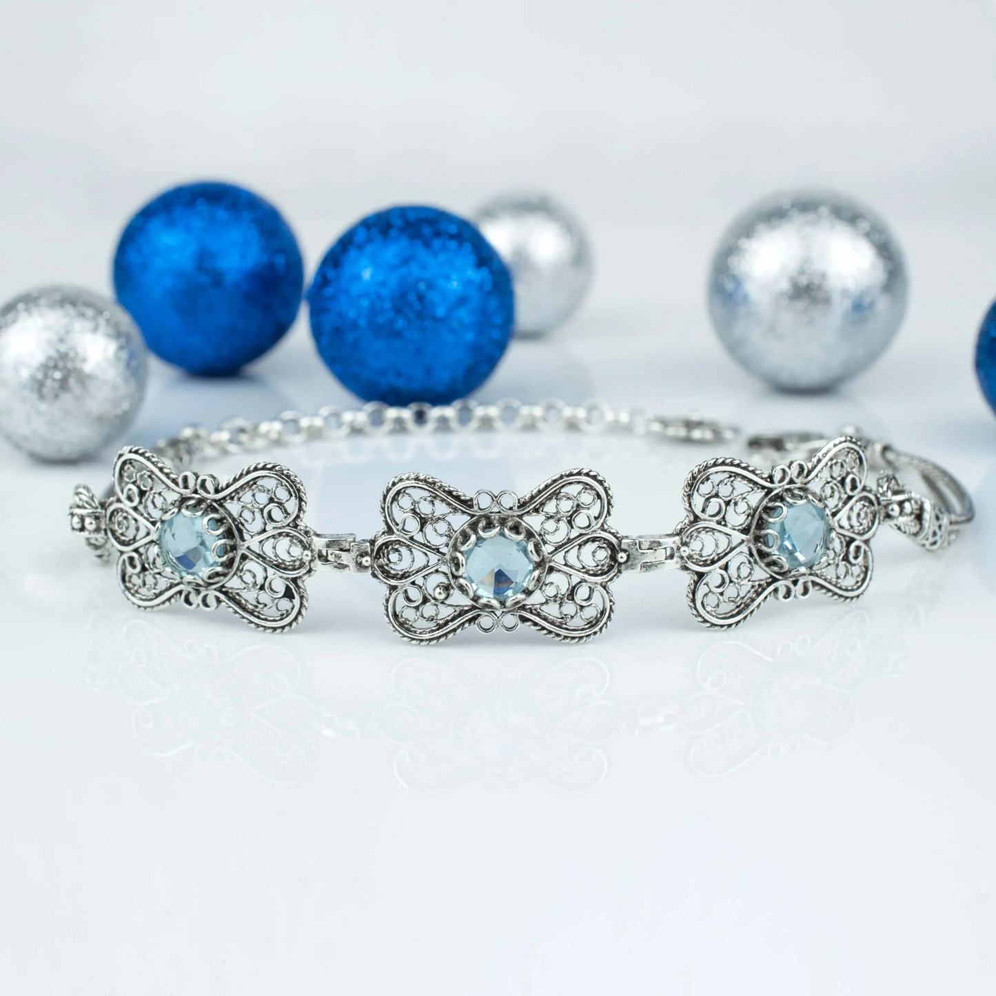 Indulge in the timeless beauty and elegance of 925 sterling silver paired with the enchanting allure of blue topaz gemstones. Order your Filigree Art Blue Topaz Gemstone Women Butterfly Silver Link Bracelet today and elevate your style with this stunning piece of jewelry.