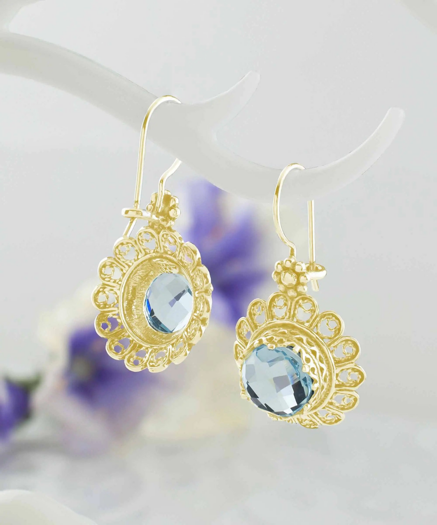 FiligranIst - Filigree Art Flower Design Gold Plated Silver Blue Topaz Gemstone Women Drop Earrings