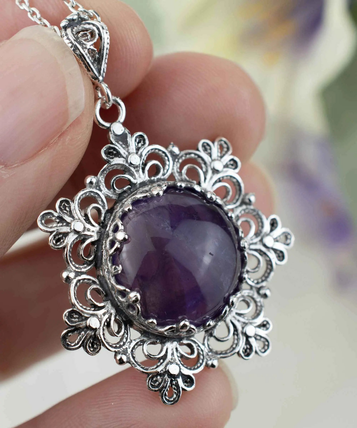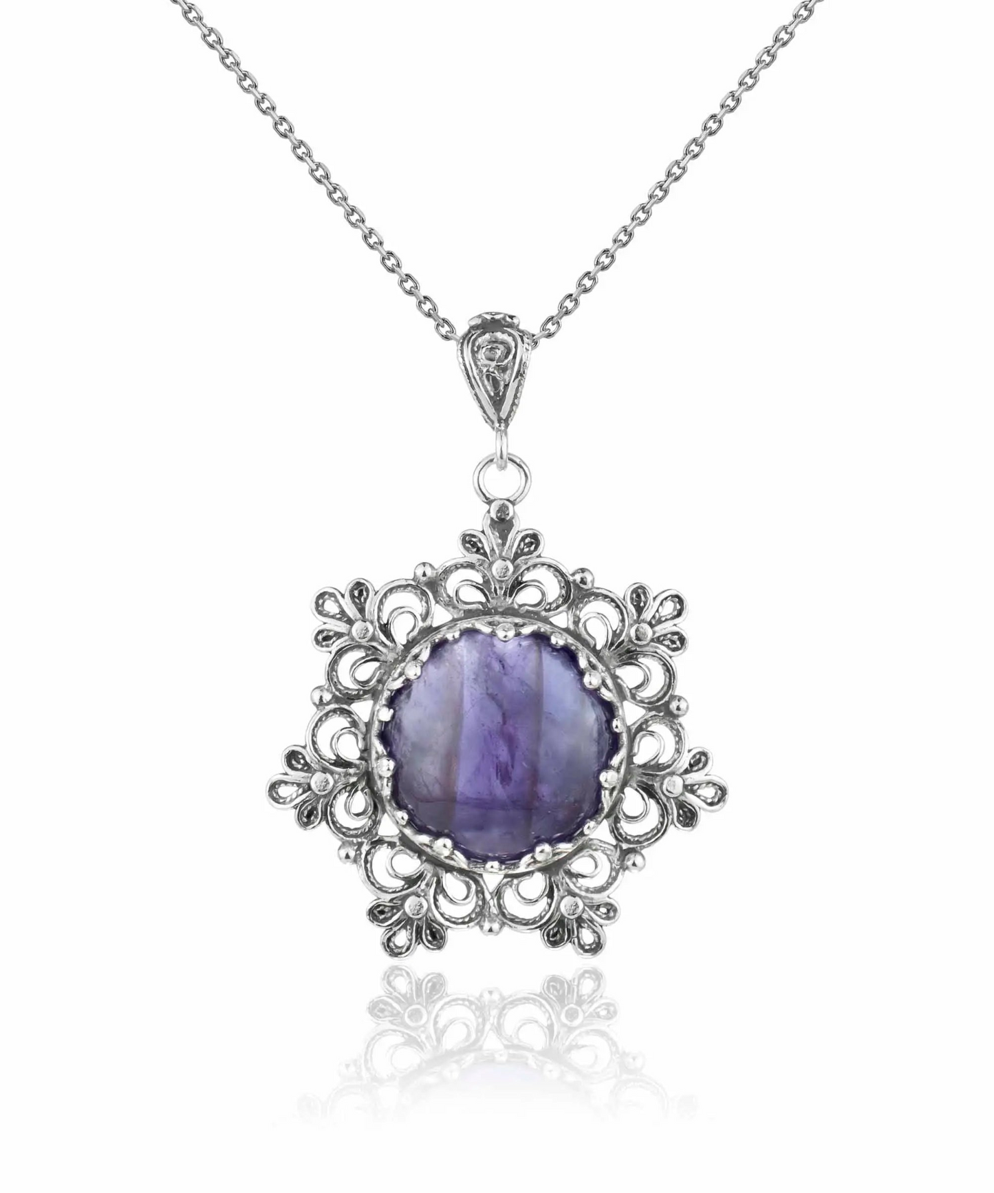 FiligranIst - Handcrafted Amethyst Gemstone Flower Silver Filigree Pendant Necklace