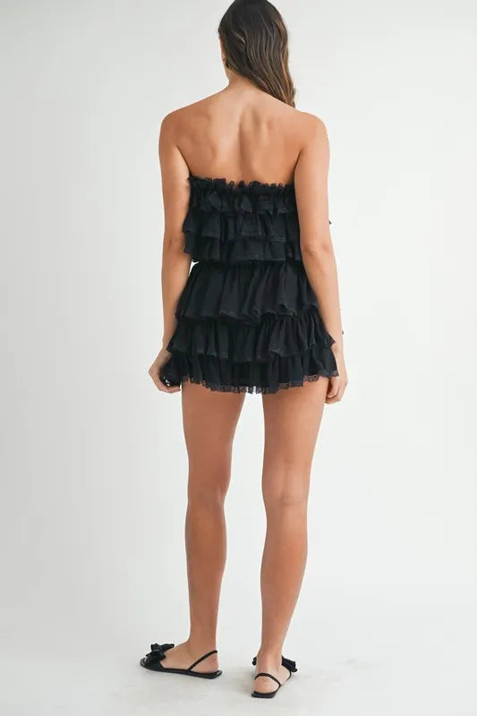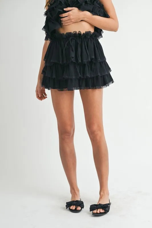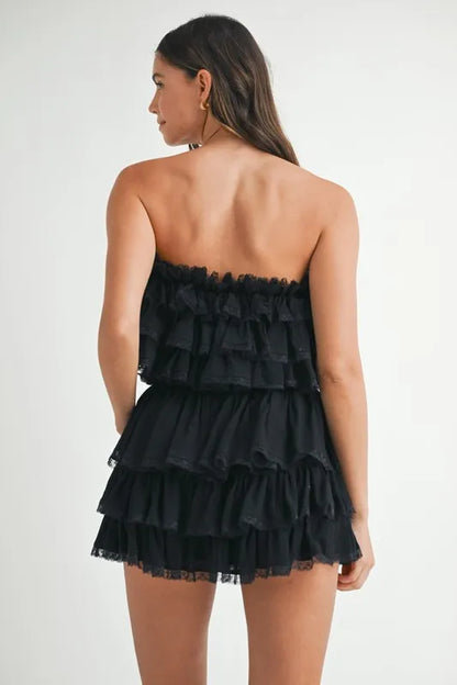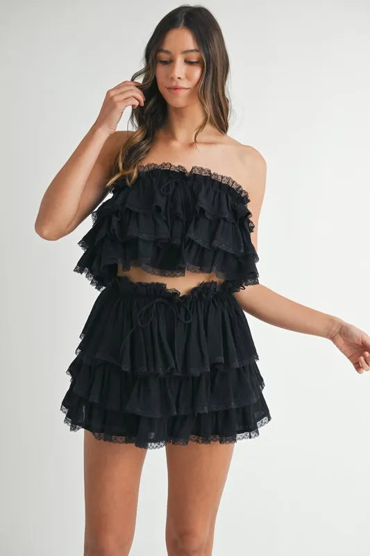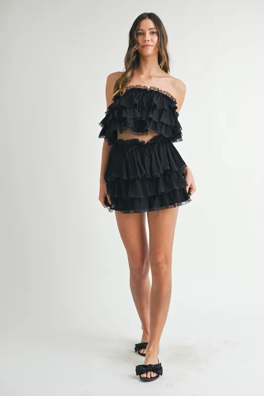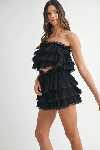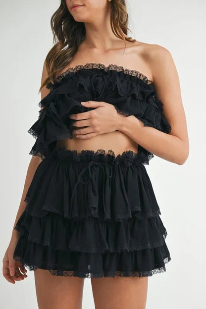 MABLE Ruffle Layered Crop Top and Mini Skirt Set - Black