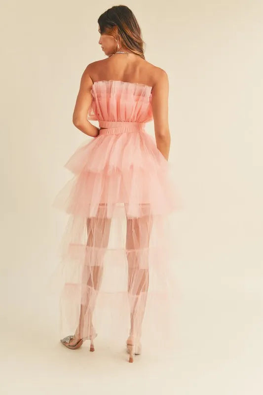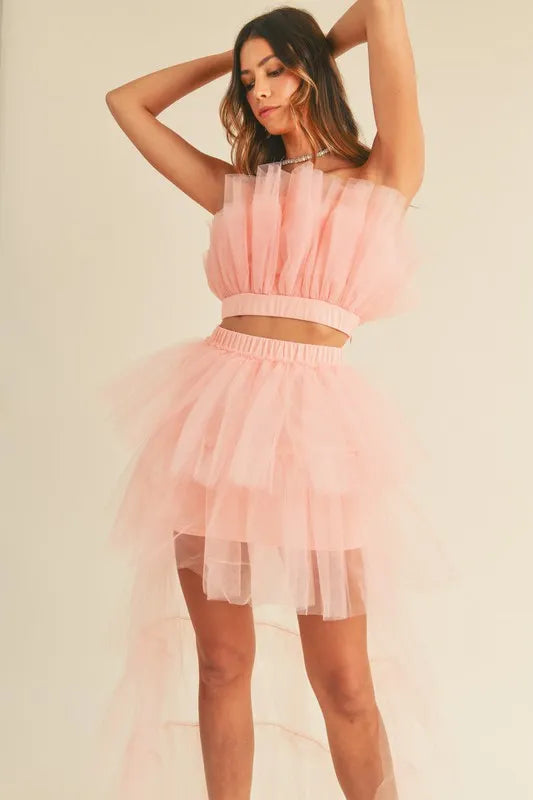 MABLE Tulle Tube Ruffle Crop Top and High Low Maxi Skirt Set - Blush