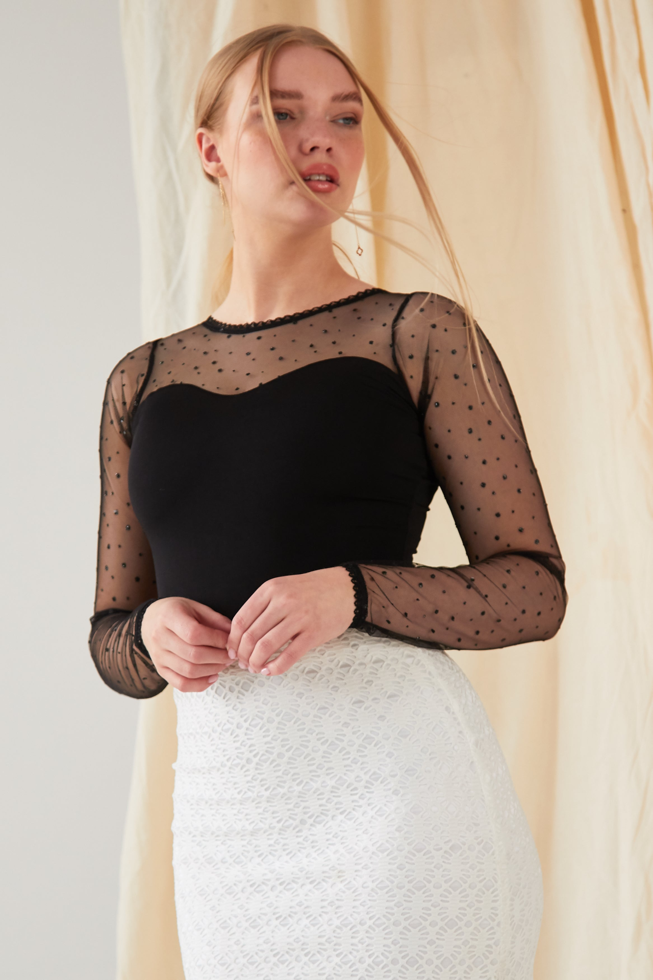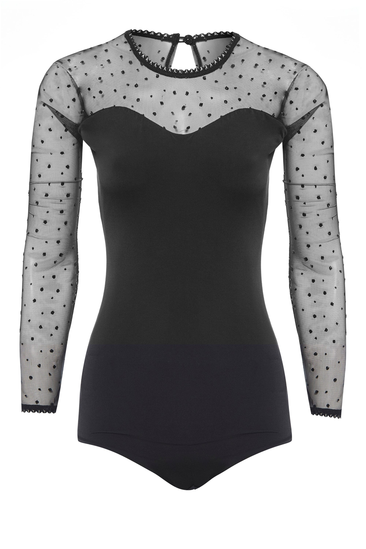 - Glitter Mesh Bodysuit with an eye-catching polka dot design